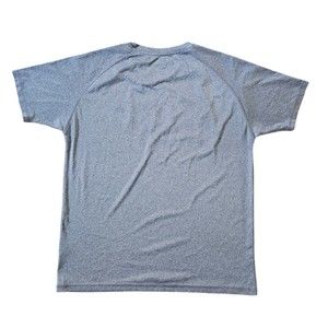 This shirt is grey with an orange logo. It is 100% polyester and has a stay dry/athletic feel.