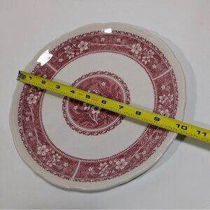 Vintage dinner plate with intricate floral pattern. Features red and white hues, ideal for collectors or adding elegance to table settings.