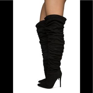 Black Over the Knee Thigh High Pointed Toe Scrunchy Boots, Step into fall in complete style with these thigh high boots they compliment any outfit 4.25” heel