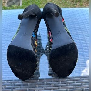 Stylish black mesh heels featuring vibrant red and yellow floral embroidery. Perfect for adding a pop of color to any outfit. Great condition. The only flaw are the toe prints in each shoe