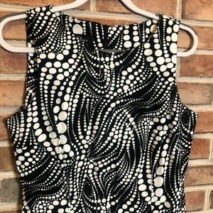 Stylish AGB sheath dress in size 14 featuring a black and white abstract design and cap sleeves. Perfect for professional or casual settings.