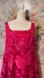 Bold cherry red with hot pink large floral pattern, long back zipper, pleated skirt, high low, lined on upper body to just past the waist.