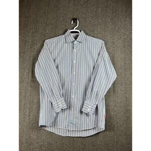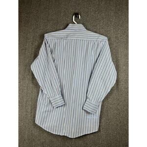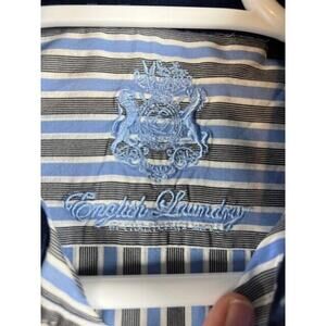 Elevate your wardrobe with this classic button-up shirt from English Laundry. The shirt features a striped pattern, long sleeves, and a collared neckline with a spread collar style. It is perfect for both casual and business occasions and is made of comfortable cotton material that is machine washable. The shirt has a chest size of 46 inches, a regular fit, and is available in size 16. It also features an embroidered logo, button accents, and a flip cuff for added style. This shirt is a must-have for any fashion-conscious man and is sure to become a staple in any wardrobe.