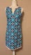 Moroccan Quatrefoil Print in Bold Colors of Turquoise, Royal Blue, Navy Blue and White, White Pom Pom hemline, Subtle textured fabric, Darting at chest, Sleeveless, Fully Lined Lace Bottom Lining, Zippered Back, Gold Zipper Pull, V-neck with white piping detail