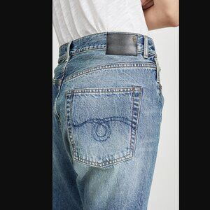 Loose, slouchy fit; slightly dropped crotch, straight cut off hem with raw details, a few paint splatters on front and on rear pocket, and small slit detail above knee 1.25” across.
