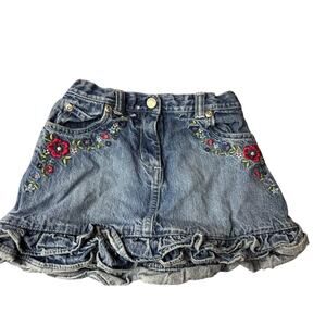 This is a vintage Gymboree denim skirt for girls in size 3T. It features embroidered flowers and a ruffle accent, giving it a 90s Y2K style. The skirt is made of denim fabric and is a mini length.