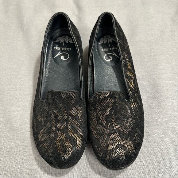Size 26 Dansko Olivia black/gold snake print loafters. Slip on, round toe, leather upper. Great comfort shoe brand.