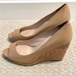 Camel patent leather wedges from Prada with basketweave heel detail. Good condition, worn a few times. Purchased directly from the Prada boutique.
