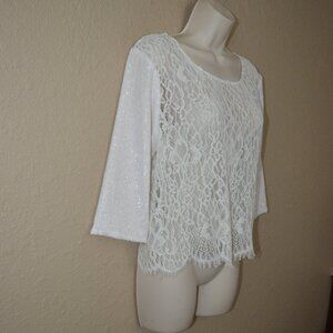 Sz 4 Loyd/Ford White Lace Top Contrast Sequin 3/4 Sleeve Blouse Top