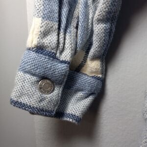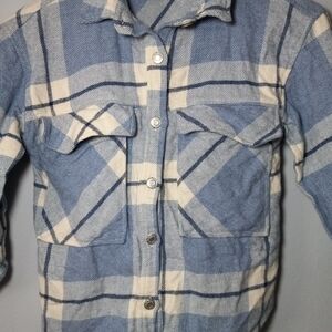 Stylish blue and cream plaid jacket with button closure. Features two front pockets.