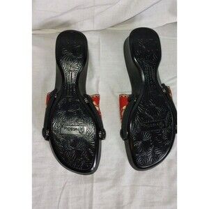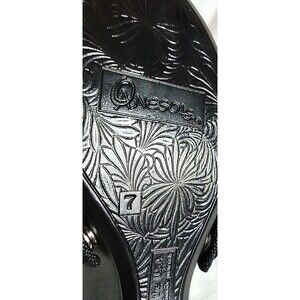 These are new black Onesole slip-on sandals with 5 sets of interchangeable tops. The size 7 sandals have a high wedge heel and an open toe. The synthetic and spandex upper material is stretchy and breathable, making them comfortable for travel.