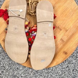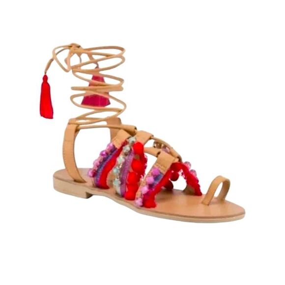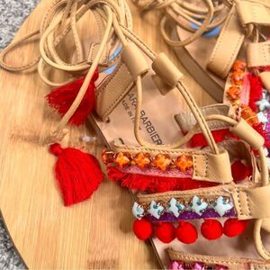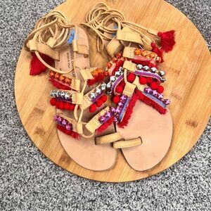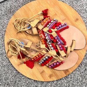 Sz 7.5 Barbara Barbieri Leather Lace Up Tassel Studded Pom Pom Strappy Sandals