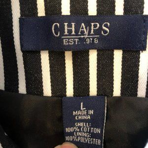 Stylish and sophisticated Sz L Chaps black and white pinstriped LS button up blazer. Made from cotton, it's a comfortable and fashionable addition to any wardrobe.