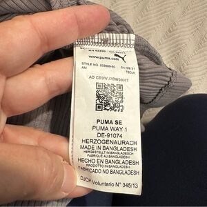 Size large wrap crop top by Puma, long sleeves, Stormfront Gray color, 58% cotton/39% polyester/3% elastane. Puma logo on the side, deep V neck.