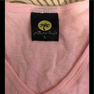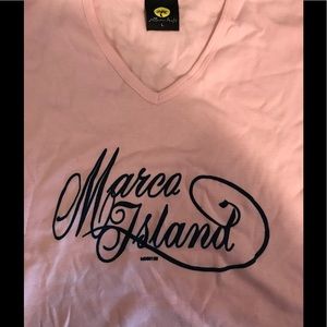 Sz L pink with script Marco Island tee. Slim fit style in very good condition except one very small stain on front as detailed in last photo. Otherwise in excellent condition.