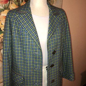 Vintage Wool Light Green, Royal Blue & Grey Plaid with Black Buttons, Four Grey Front Buttons, Two Front Pockets with Flap, Grey Trimmed Lapel and Pocket Flaps, Cuffed Sleeve End with Button detail. Fully Lined Royal Blue Silk like Feel Lining. Hits about 3 inches past knee (I'm 5'6"). Dry Clean Only.
