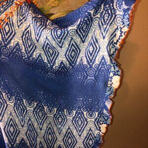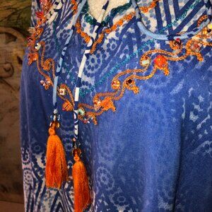 Royal Blue and White with Diamond Designs, dots, ombre horizontal striping, Tie Front with Orange Tassels, Poncho style with closed stitched arm holes, Ruffle border with orange stitching on hemline, Turquoise Sequin border around V-neck, Orange embroidered swirls with plastic beading. Easy to pack and wash.