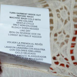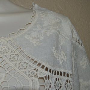 EUC (Pristine Condition), Size Small, 100% Cotton, Ivory or Cream Colored Embroidered Boho Tunic Shirt with crochet/doily patterns on Front and Sleeves, Back is Fully Embroidered with Cream Floral Pattern. Exposed seam, 3/4" Sleeves, Loop trim detail on collar and sleeve ends. Machine Wash Cold.