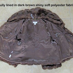 From Ann Taylor Loft here is a Size Small faux fur button front bolero jacket, with a dark brown soft richly colored 84% acrylic and 16% polyester fabric. A collar that can be folded either up or down, 2 hidden front pockets and 3 front buttons complete the details of this fully lined blazer. With no apparent signs this was ever worn by anyone other than my model, this bolero is in Excellent Vintage Condition.
