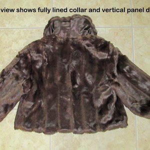 Photos show how lovely the faux fur texture is and how the collar can be up or down. The design mimics vertical pelts of thick fur.