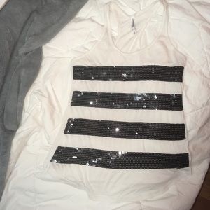 Size small racerback tank white with black sequened horizontal stripes to front. In perfect condition. Can be worn dressed up or down.
