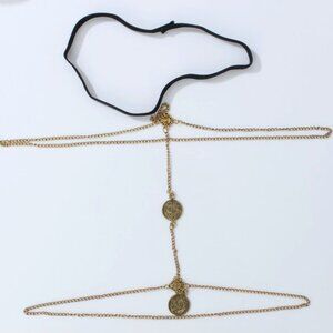 Add some bohemian-chic vibes to your look with this stunning medallion body jewelry! Featuring chunky, gold coin medallion pendants and dainty multi-layered chains. Hidden elastic waist strap to hold in place. Fits size small.  Perfect for wearing underneath your favorite bikini or mini dress.