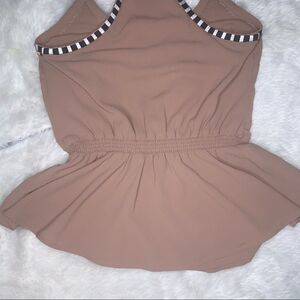 Used but good condition size small Bebe halter top. Body is a beautiful nude tan pink. Has black and white striping and gold sequins. Sides were taken in a little, see photos. Can be worn casual or as a going out shirt, very versatile