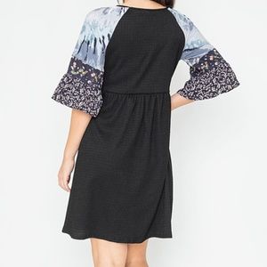 Play with prints and solids with successful grace in this lovely fit-and-flare dress. Lightweight, fluttery ruffles finish the dramatic triple-print sleeves with sweet charm.