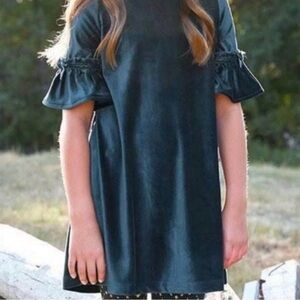 A darling A-line dress with bows and ruffles on the sleeves and a button key-hole in the back for easy on/off. Perfect for the holidays!