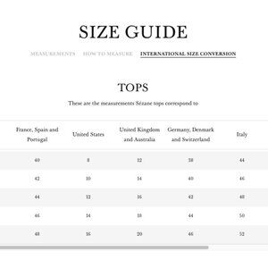 Size: 44 (fits like a US 12). Please note the tag says EU Size 44. Sezane's sizing chart says that it fits like a US Size 12. I added images of the Sezane sizing chart and conversion from their website.
