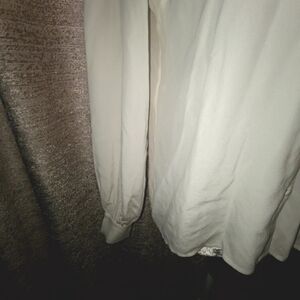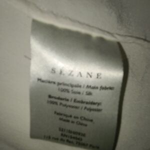This elegant Sézane blouse in a soft cream color features long bishop sleeves and a charming Peter Pan collar. The blouse is designed with a ruffled texture, adding a touch of sophistication to its flowy silhouette. Perfect for both casual and formal occasions, it offers a timeless style that complements any wardrobe.