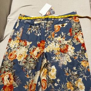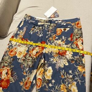 Cotton/ linen unlined trousers 7/8 length, straight wide leg, stitched pleats at front, patch pockets at front, zip fly, inside length 27