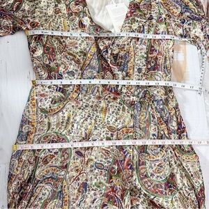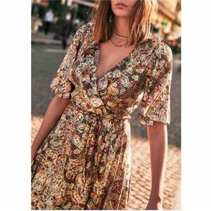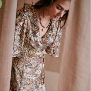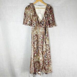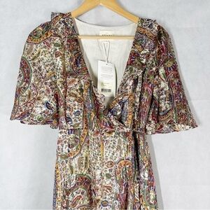 Sézane Paula Gold Metallic Shimmer Silk Blend Midi Dress Paisley Size US 2. New with tag, no noticeable flaws. Midi length wrap around dress