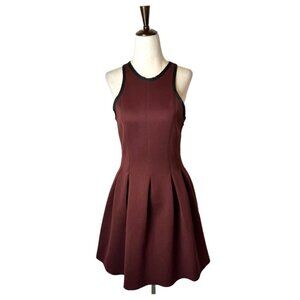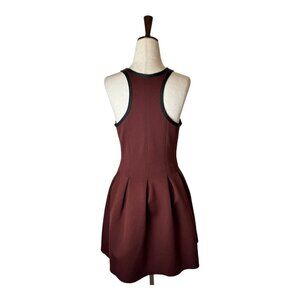 This dress from T Alexander Wang is in excellent condition. It is a solid brown color with black trim. It features; a crew neckline, sleeveless, racerback, side zipper closure, fit and flare skater silhouette, mini length and a pleated skirt. Made from a polyester and spandex blend.