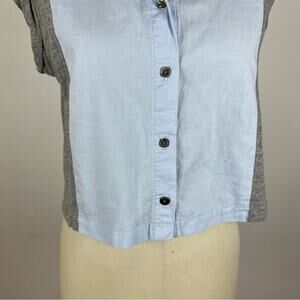 Great used condition. No size tag. Fits like a small. Has fading throughout. Short sleeve, button down. I9