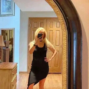 Excellent preowned condition. No rips, stains, tears. No material or size tag. The material is very heavy and most likely a viscose, spandex, polyester blend. The chain detail on the top part is covered with a mesh materials so it will not snag the dress or catch on other jewelry. Has lots of stretch.