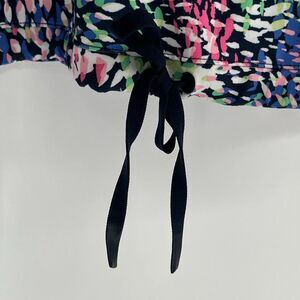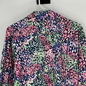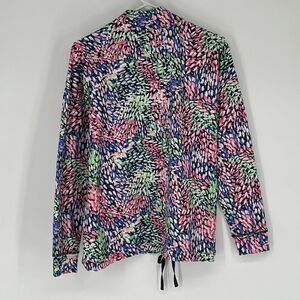 This T BY TALBOTS athleisure jacket is designed for comfort, movement, and everyday versatility. Made from a lightweight stretch fabric, it features a multicolor abstract print that adds interest while remaining easy to style. The full zip front and stand collar provide coverage, while the adjustable drawstring hem allows for a customizable fit. Built-in UPF 50+ sun protection makes this an excellent choice for outdoor activities, travel, walking, or casual active wear.