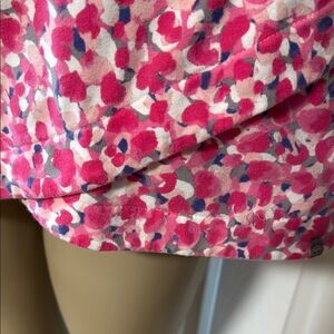Add a splash of color to your wardrobe with this stylish pink patterned top. It is perfect for any casual outing and is in excellent condition. Measurements: Pit to pit: 21 inches, Length: 27.5 inches. Features a tulip hem and a pullover design with a zip neck.