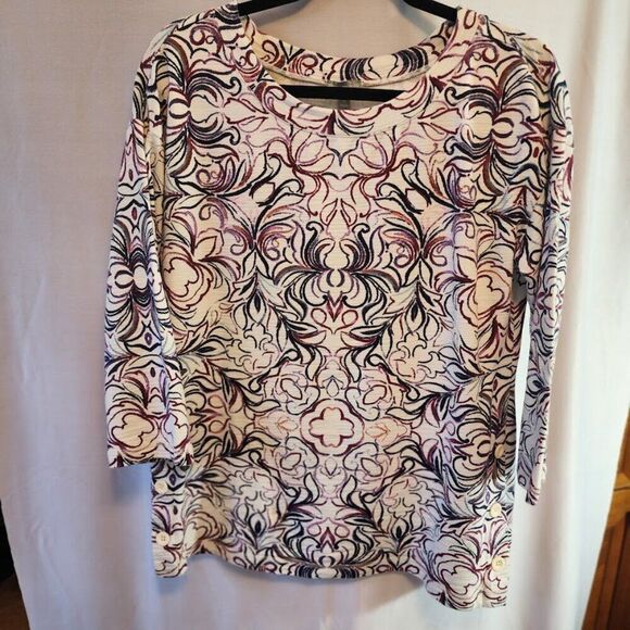 NAME: T BY TALBOTS TOP, SIZE MEDIUM, RELAXED, 3/4 SLEEVES, FALL COLORS ON WHITE BACKGROUND, GREAT LENGTH, BUTTON DETAIL ON SIDES, 1 IS FUNCTIONAL, COTTON MODAL/SPANDEX, HAS STRETCH,
