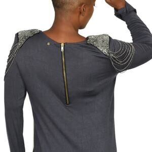F.E.M. by T-Bags maternity t-shirt dress FEATURES a soft jersey cotton fabric and glam statement shoulder epaulets. Thick shoulder pads with bead chain epaulet shoulders. Round neckline. Long length. Exposed zipper in back. Mini length.