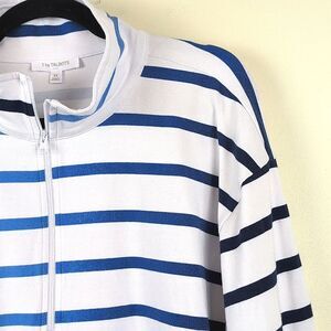 T by Talbots 3/4 Length Sleeve 1/2 Zip Pullover Plus Size Top in Tropic Stripe. This pullover shirt features a mock turtleneck, side slits at the hem, and a blue ombre stripe colorway. Super soft terry blend in 59% cotton, 36% modal, and 5% spandex. Size 3X.