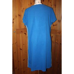 Perfect dress to wear with your sneakers. Athletic style dress with a black/shite racer stripe down the sides. Pique texture to the material. 40" long, 24" pit to pit and 6" long short sleeve length. 95% cotton and 5% spandex. Pristine pre-loved condition from a smoke-free, pet-free home.