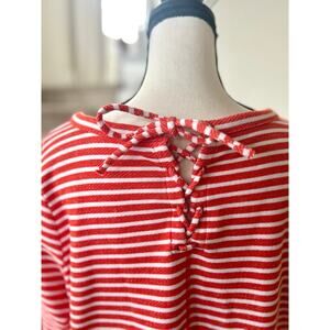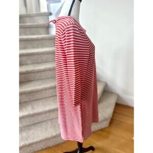 Excellent condition. Orange and white stripe, the orange can read as an orange toned red in some light. 3/4 Bracelet length sleeve, knee length, shift style. Lace up detail in the back.