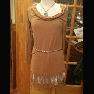 This dress is amazing.. it's buttery soft. has long sleeves.. A cowl off the shoulder top.. With a fringe bottom. Made in the USA. LENGTH IS 26IN. With approx. 6 in fringe .. sleeves length collar to cuff in 27in. ( belt not included .. used as accessory. You can bundle.