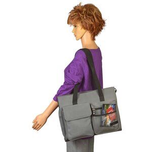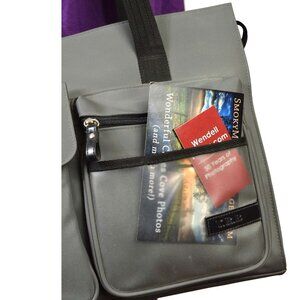 Excellent like new pre-loved condition! From a smoke/pet free home. Very nice! Inside, it has a zippered pocket and divider in the center. The front and back of the bag feel like they are padded which would be perfect for a tablet or a laptop! Has top zipper closure. On the outside, there is a pocket on the front with Velcro closure, a zippered pocket and a see-through pocket as well! Measures approx. 15"long x 11"high x 6"deep. Double strap drop is approx. 14". The material is an easy clean material. Just wipe off and go! PLEASE ALWAYS LOOK CLOSELY AT ALL THE PHOTOS BEFORE DECIDING TO MAKE A PURCHASE IN CASE I MISSED SOMETHING.