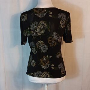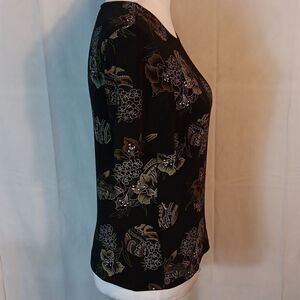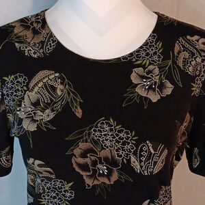 Elegant black top with a floral design, perfect for any occasion. Size Large with a pit to pit measuring 20" and a length of 24".