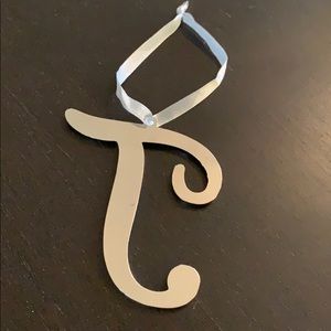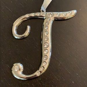 Cursive “T” Rhinestone Ornament on Ribbon for hanging- 3.5 inches in height and 3.5 inches in width (at widest point).