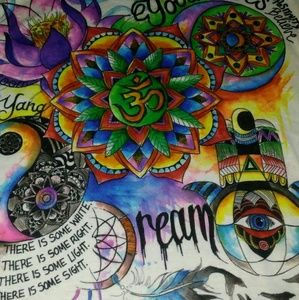 Boho t shirt white with meditating designs on it. Says a x large but more like a Med .. very comfortable