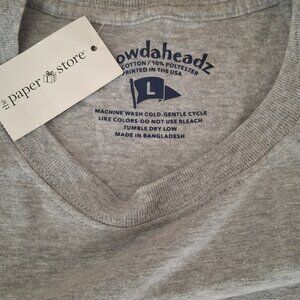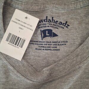T-shirt, Chowdaheadz, red, white, and blue "Foxboro Faithful" on front, back plain, gray base tee. New with tag. 90% cotton, 10% polyester, made in Bangladesh. Tagged as a Size L, Large. Sizing often varies between brands. Please note these actual measurements. Measuring laying flat: Armpit to armpit = 21.5 inches. Measuring down the center of the back, not counting the collar band = 29 inches. New, never worn item in good condition, good decal/decoration, no holes, no tears, no stains.