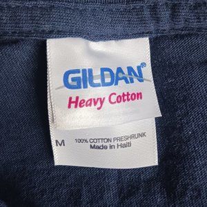 T-Shirt, Kellogg School of Management, Northwestern University, Kellogg Soccer Club, 2014, Kellogg World Cup. White and gray on navy blue base tee. Logo front at breast area, overall logo and printing on back. Gildan Heavy Cotton, 100% cotton, made in Haiti. Tagged as a Size M, Medium. Sizing often varies between brands. Please note these actual measurements. Measuring laying flat: Armpit to armpit = 19.5 inches. Measuring down the center of the back, not counting the collar band = 27 inches. Pre-owned item in good condition, good decal/decoration, no holes, no tears, no stains.